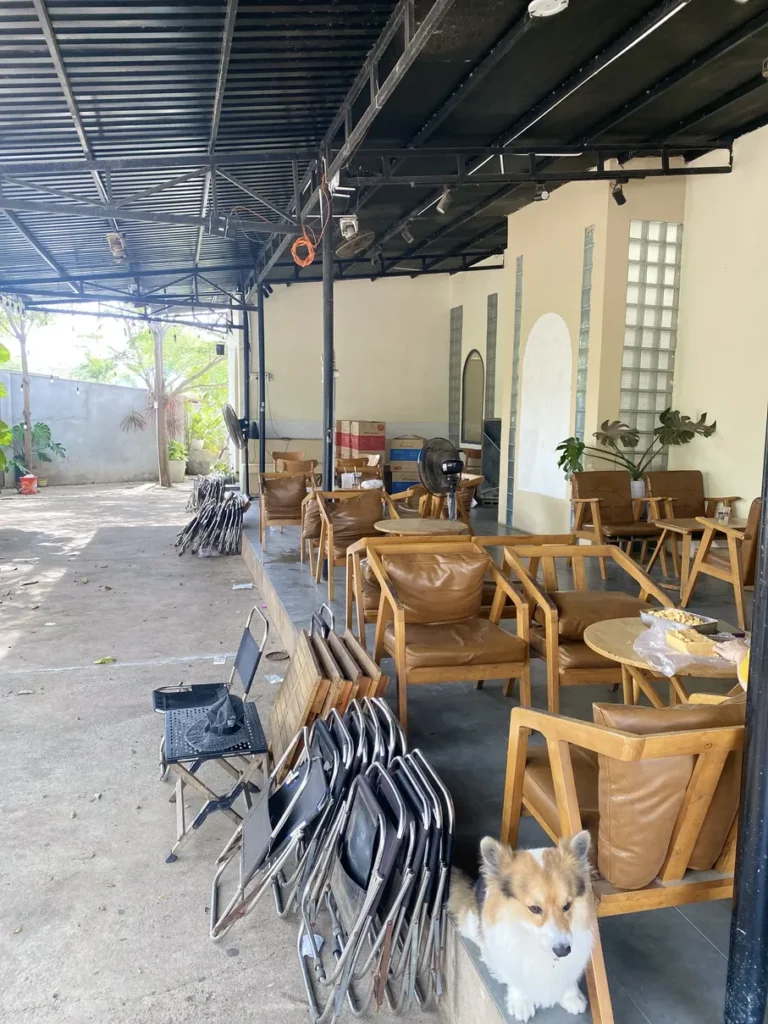 - Trong nhà: Ấm cúng, tường gạch thô, đèn dây vàng, có góc chụp ảnh với hình Corgi cute.
